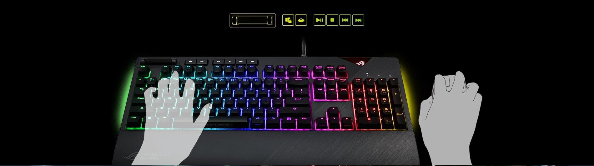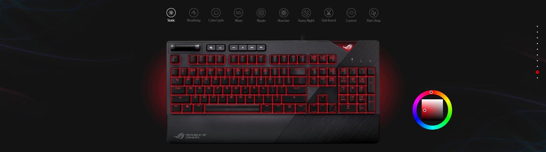 Bàn phím được hỗ trợ tuỳ chỉnh hiệu ứng ánh sáng theo sở thích thông qua phần mềm Aura Sync. Qua đó bạn có thể đồng bộ ánh sáng cùng với các thiết bị khác có sử dụng Aura Sync