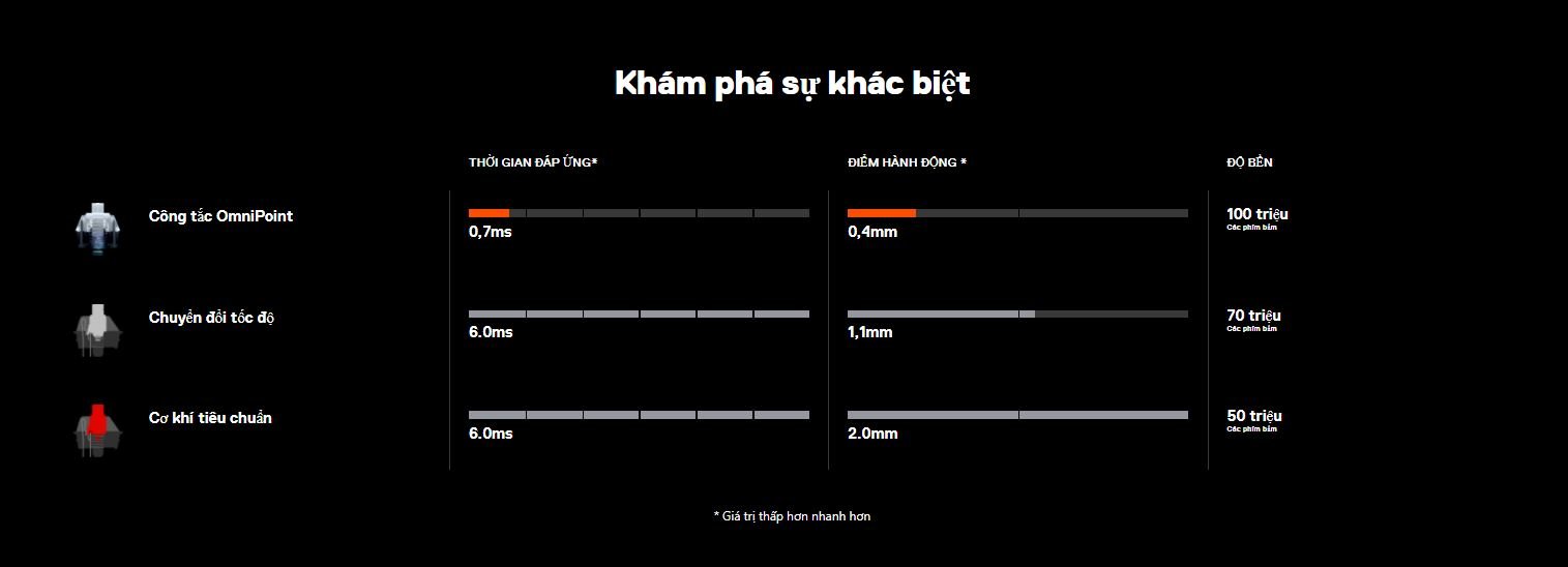 Chọn bàn phím này nếu bạn muốn có một bàn phím khác biệt với số đông, đột phá trong cấu trúc bàn phím với OmniPoint Switch nhờ hành trình phím nhanh nhất chỉ 0,4mm và tốc độ phản hồi là 0,7ms. Phản hồi nhanh hơn gấp 8 lần, hoạt động nhanh hơn gấp 5 lần và độ bền gấp 2 lần bàn phím thông thường sử dụng switch tiêu chuẩn hay Speed switch. Bá chủ game FPS chính là chiếc bàn phím này.
